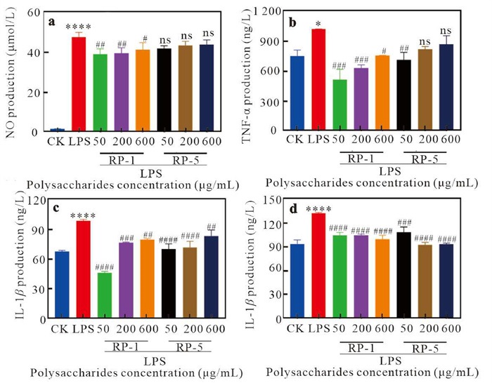 Russula vinosa Lindblad (R. vinosa Lindblad) is a nutrient-rich wild edible fungus, abundant in carbohydrates. In this study, two polysaccharides (Russula polysaccharides extracted from 1% KOH (RP-1) and Russula polysaccharides extracted from 5% KOH (RP-5)) were extracted from Russula fruit bodies using KOH-graded extraction technology. The molecular weights of RP-1 and RP-5 were 187000 and 97300 u, respectively. Their glycosyl compositions (galactose꞉glucose꞉xylose꞉ mannose, i.e., Gal꞉Glu꞉Xyl꞉Man) were 0.27:1.00:0.01:0.16 for RP-1 and 0.12:1.00:0.03:0.19 for RP-5. Nuclear magnetic resonance (NMR) analysis revealed that the main structural component of RP-1 was →3,6)-β-d-Glup-(1→, with a →6)-β-d-Glup-(1→ residue linked at sites 1 and 6, and a →3)-β-d-Glup-(1→ residue linked at sites 3. The RP-5 shared this structure with an additional →4)-β-d-Manp-(1→ residue attached to the →3)-β-d-Glup-(1→. Phagocytosis assay demonstrated that RP-5, with a lower molecular weight, lower galactose content, and higher xylose and mannose content, enhanced RAW 264.7 cell phagocytic activity by 121.04%, outperforming RP-1, which showed a 42.15% increase at the same concentration of 600 μg/mL. Furthermore, both RP-1 and RP-5 reduced the release of inflammatory factors and induced the nuclear translocation of the nuclear transcription factor-κB (NF-κB) pathway in RAW 264.7 cells. This study provided insights into the structural characteristics and immunomodulatory properties of Russula polysaccharides, offering potential for further applications in bioactive compound development.